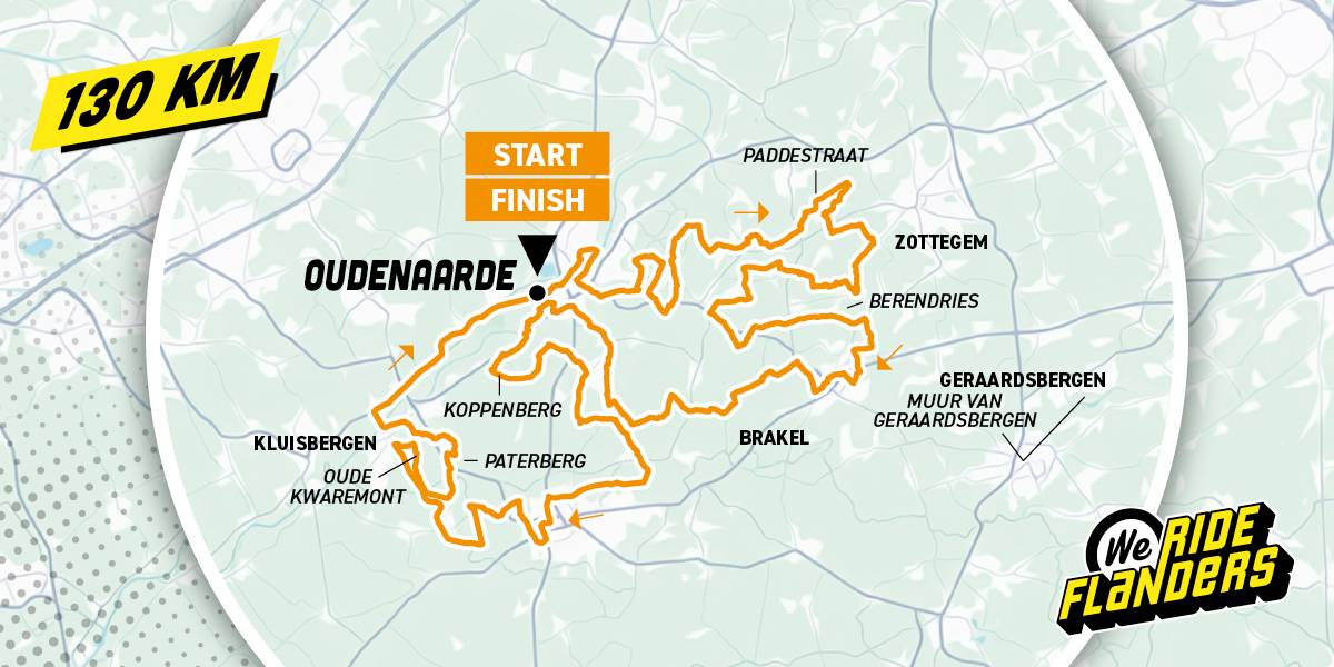 You have a choice of 4 different distances: 80 km, 130 km, 160 km or 240 km. * The longest distance (240 km) starts just like the pros from Antwerp and. The other distances (80, 130 & 160 km) start from Oudenaarde. All distances finish in Oudenaarde.